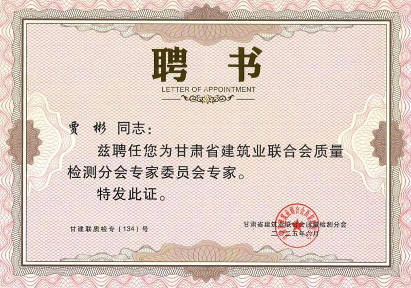 祝賀我公司勞海洋、楊晶晶、賈彬三名同志被甘肅省建筑業(yè)聯(lián)合會質(zhì)量檢測分會聘請為專家。為甘肅省建筑質(zhì)量檢測行業(yè)發(fā)揮自己的專業(yè)技術(shù)知識。